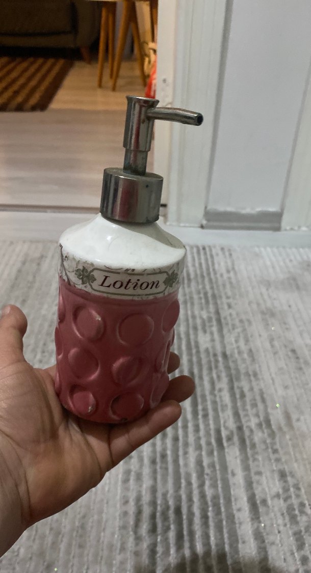 Pembe dokulu taban ve beyaz üst kısmı olan, metal pompalı losyon şişesi.