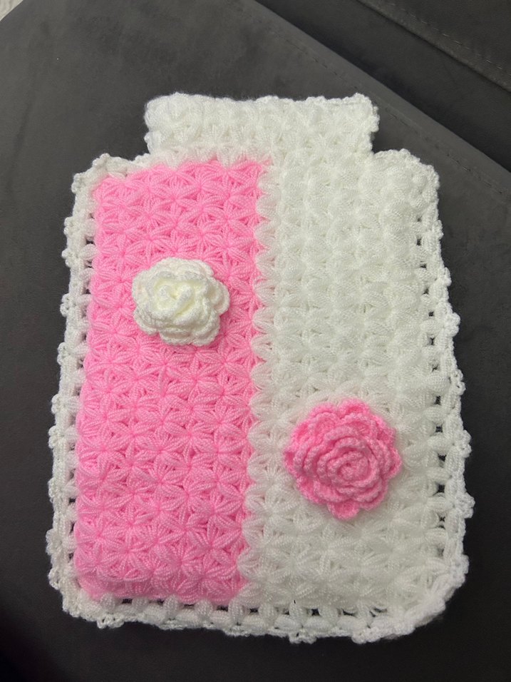 Pembe ve beyaz renklerin kullanıldığı, çiçek detaylı yumuşak dokulu banyo lifi ürünler el emeğidir.