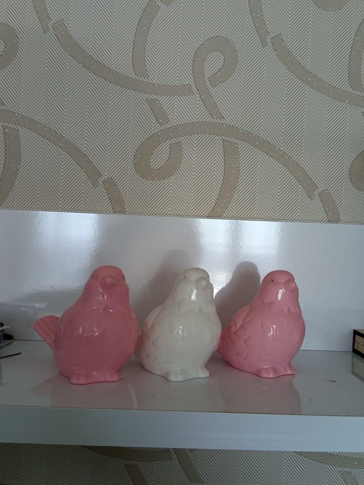 Pastel pembe ve beyaz renkte, seramik malzemeden yapılmış kuş figürleri seti, dekorasyon için uygundur.