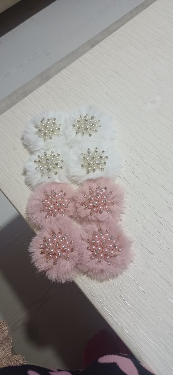 İnci ve boncuk detaylı pembe ve beyaz tüylü pastel patik süsleri, zarif bir görünüm sağlar.