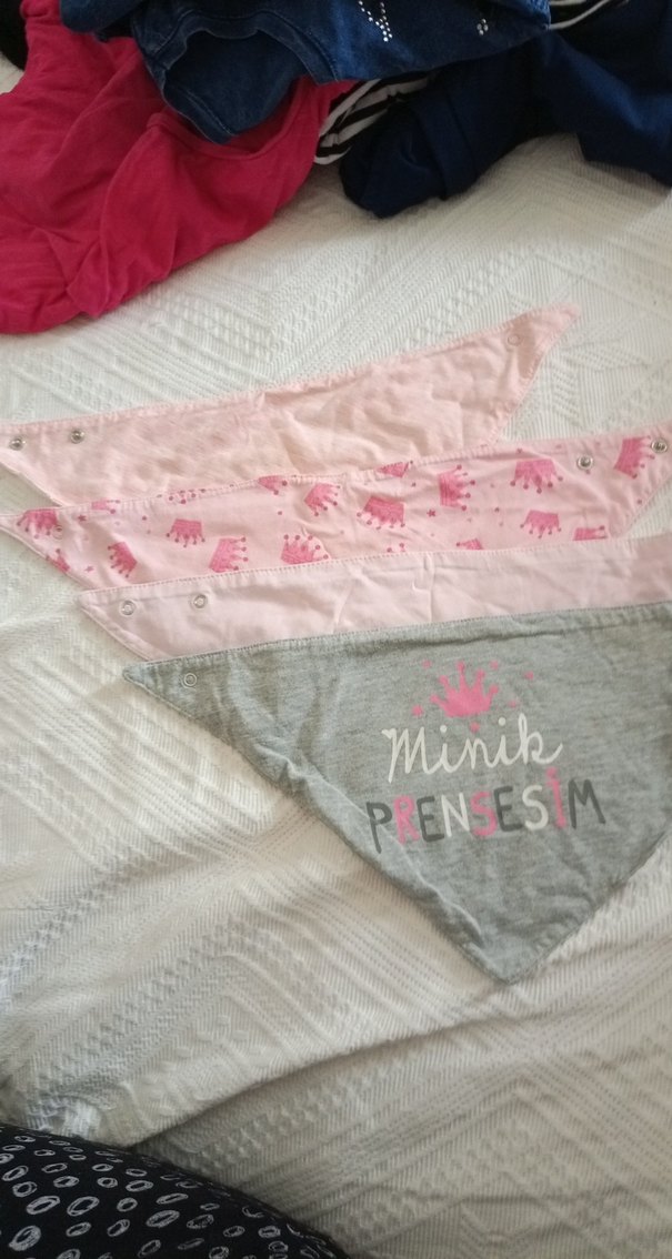 Pembe ve gri renklerde baskılı üçlü bebek önlüğü seti. Gri önlük üzerinde "Minik Prensesim" yazısı bulunur. Yumuşak kumaş, çıtçıtlı kapanışlı.