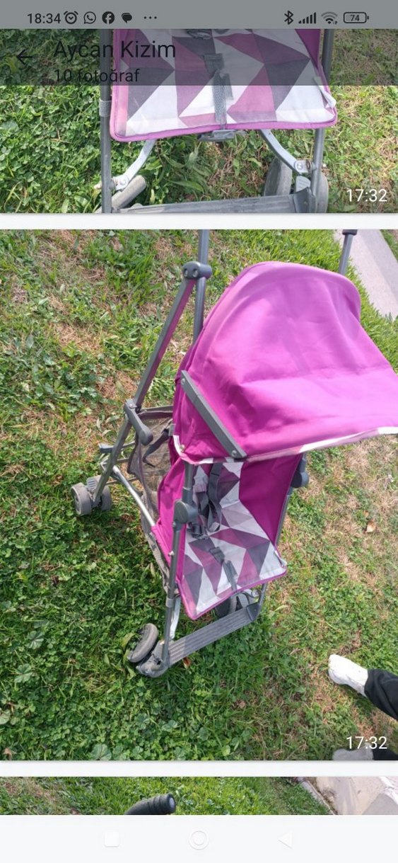Pembe tente ve gri geometrik desenli oturma yeri olan hafif yapılı bebek arabasıdır. Küçük tekerlekleriyle kolay hareket ettirilir.