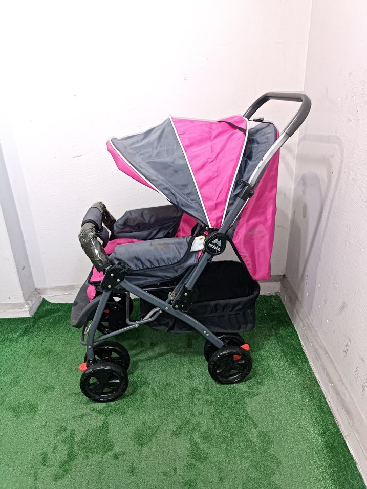 Pembe ve gri renklerde, tente ve rahat itme sapı bulunan bebek arabası. Dört tekerlekli, güvenli oturma alanı sağlar. Hiçbir sorun sıkıntısı yok tertemiz sağlamdır alabilirsiniz bende birsürü bebek arabası var sayfama bakabilirsiniz