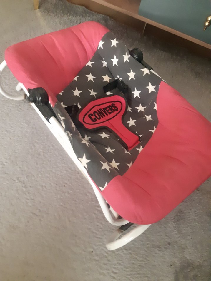 Yıldız desenli, pembe ve gri renklerde yumuşak oturma alanı ve "CONVERS" yazılı tutacağı olan bebek yatağı