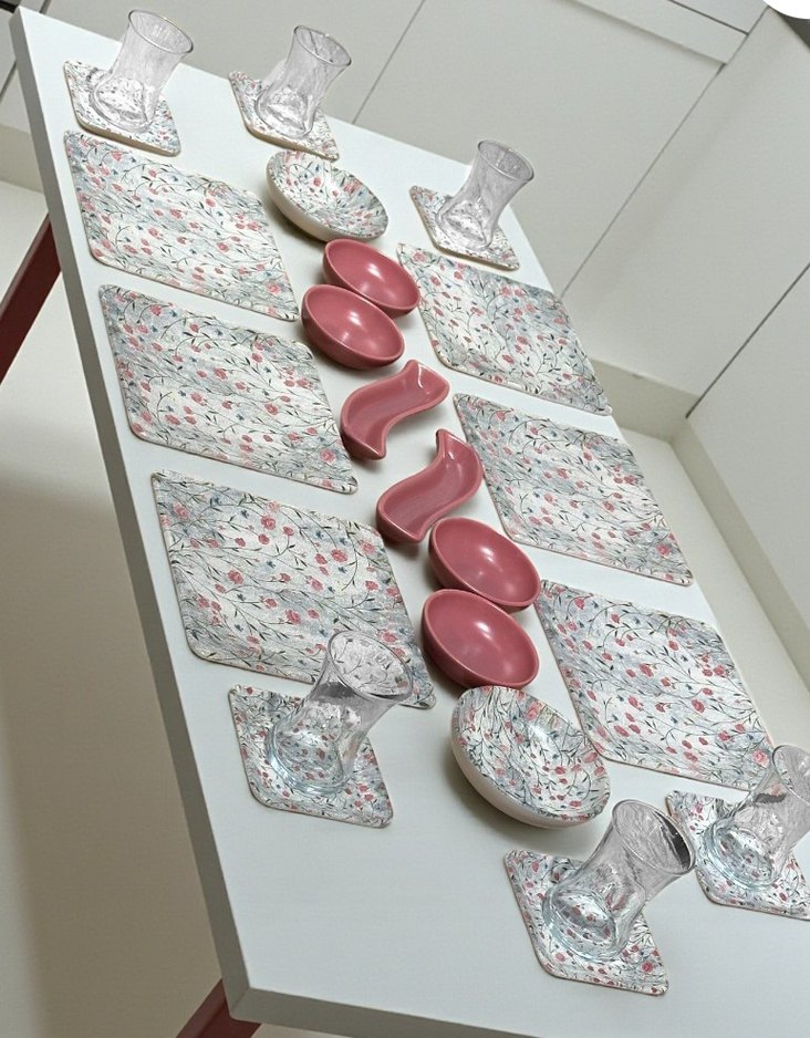 Gri ve pembe tonlarda çiçek desenli Amerikan servisler ve bardak altlıkları, pembe kaseler ve kavisli tabaklarla tamamlanmıştır. Cam çay bardakları da dahildir.