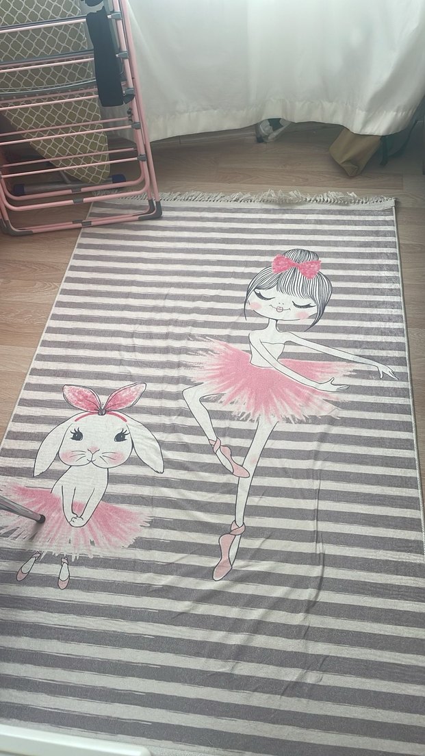Gri ve beyaz çizgili çocuk halısı, pembe bale kıyafetli kız ve tavşan figürleriyle süslenmiştir. Gösterilen leke çıkmıyordur