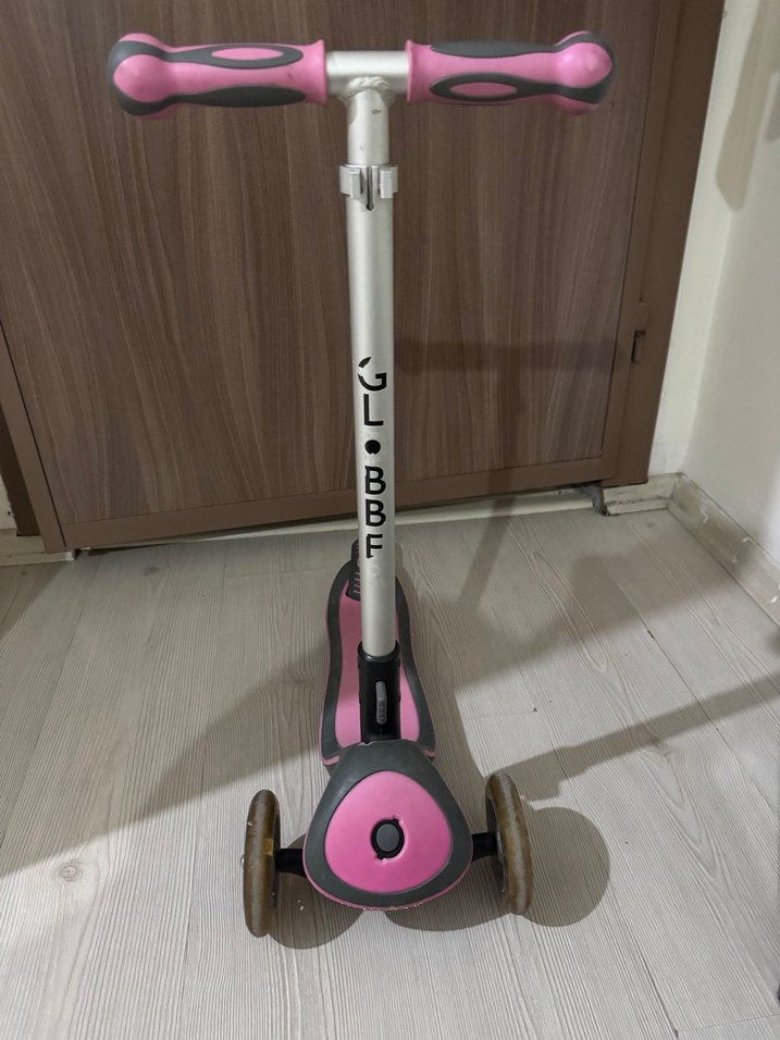 Pembe ve gri renklerde, üç tekerlekli çocuk scooter'ı. Sağlam gövdesi, geniş ayak platformu ve rahat pembe tutma kolları bulunur. Globber marka herhangi bir yerinde yazısı silinmesi dışında sorun yok ışıklı yanıp sönüyor uzayıp kısalıyor kapatılabiliyor.
