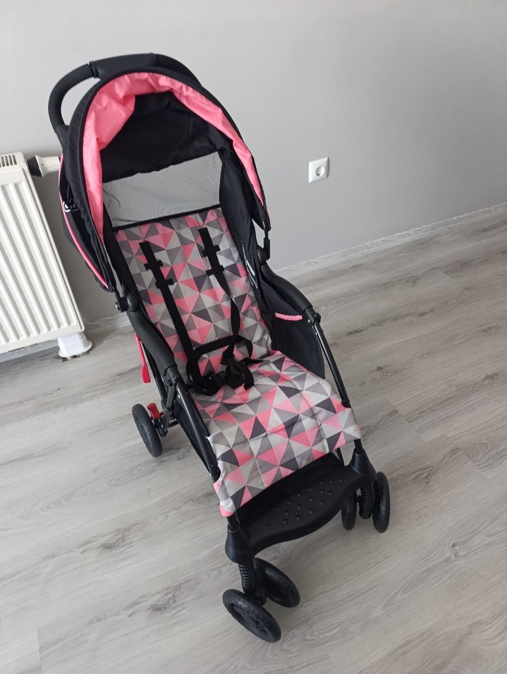 Pembe ve gri geometrik desenli oturma alanı, siyah iskelet, güneşlik, emniyet kemeri ve kolay yönlendirme için dört tekerlekli bebek arabası.