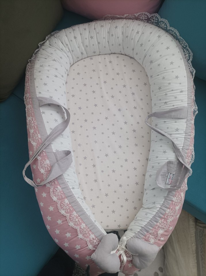 Pembe ve gri yıldız desenli, dantel detaylı ve taşıma kulplu bebek uyku yatağı. Sentetik kumaştan üretilmiştir. hiç bir sorunu yoktur temiz ve yenidir. #BABYNEST