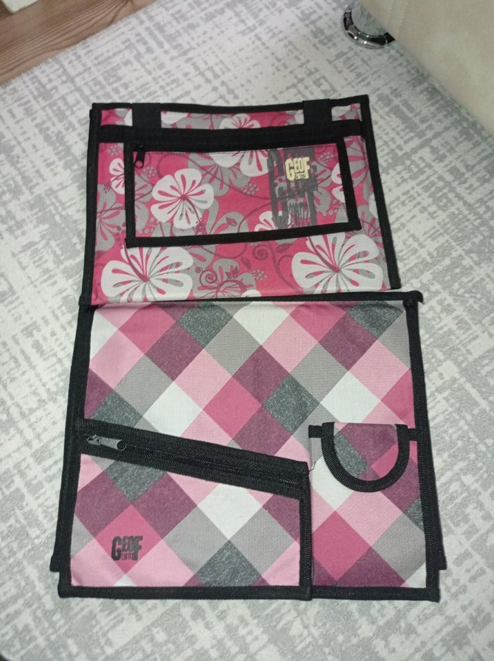Pembe ve gri çiçekli ile kareli desenlere sahip, çoklu fermuarlı bölmeleri olan defter kitap düzenleyici.