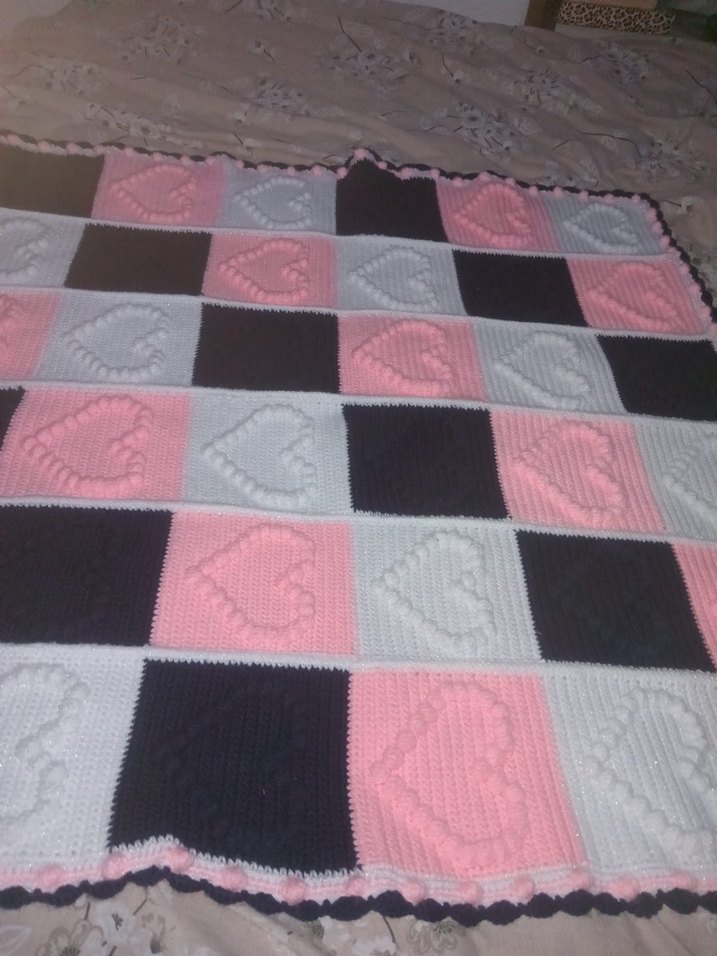 Pembe, gri ve siyah karelerden oluşan örgü çocuk battaniyesi, kalp desenli