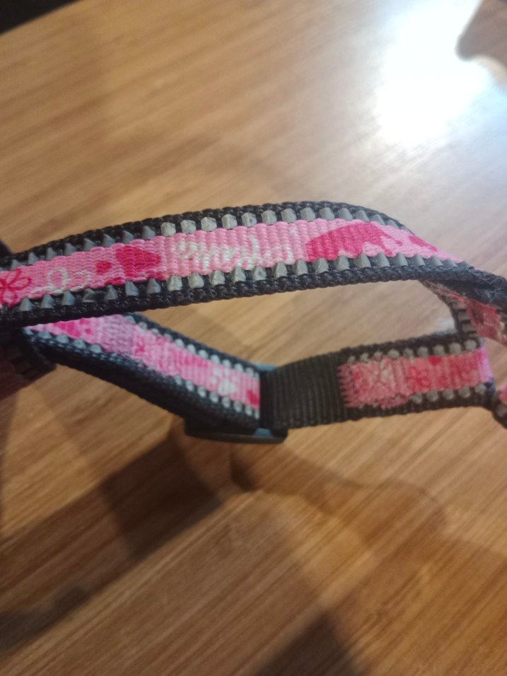 Pembe ve gri renklerde, ayarlanabilir kayışlı dayanıklı küçük ırk tasması. Kırmızı ipi sıfır.