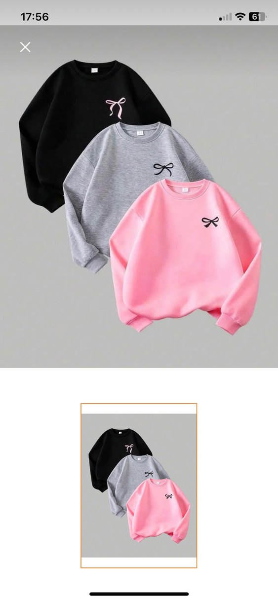 Uzun kollu, yuvarlak yaka ve bol kesim mini sweatshirtler. Göğüste küçük fiyonk baskısı bulunur. Yumuşak ve sıcak kumaştan, pembe ve gri renk seçenekleriyle.