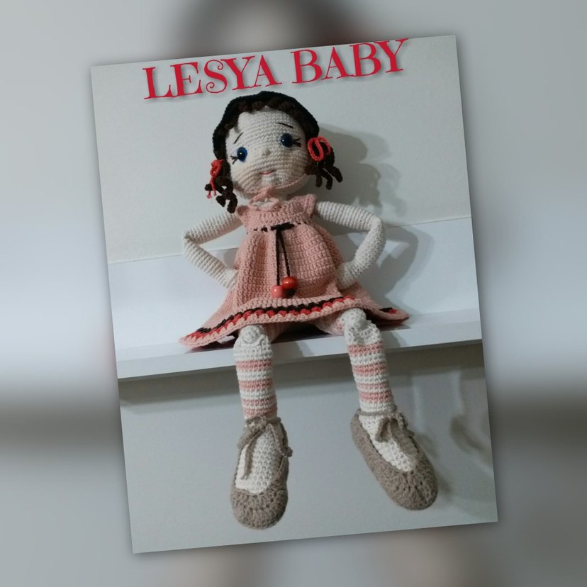 Pembe ve gri renklerde, detaylı desenli el örgüsü bebek ve şapka. Üzerinde LESYA BABY yazısı bulunur.