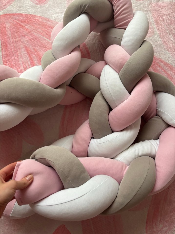 Yumuşak sentetik kumaştan yapılmış, pastel pembe, bej ve beyaz renklerde örgülü çocuk uyku koruyucusu. ️320 cm