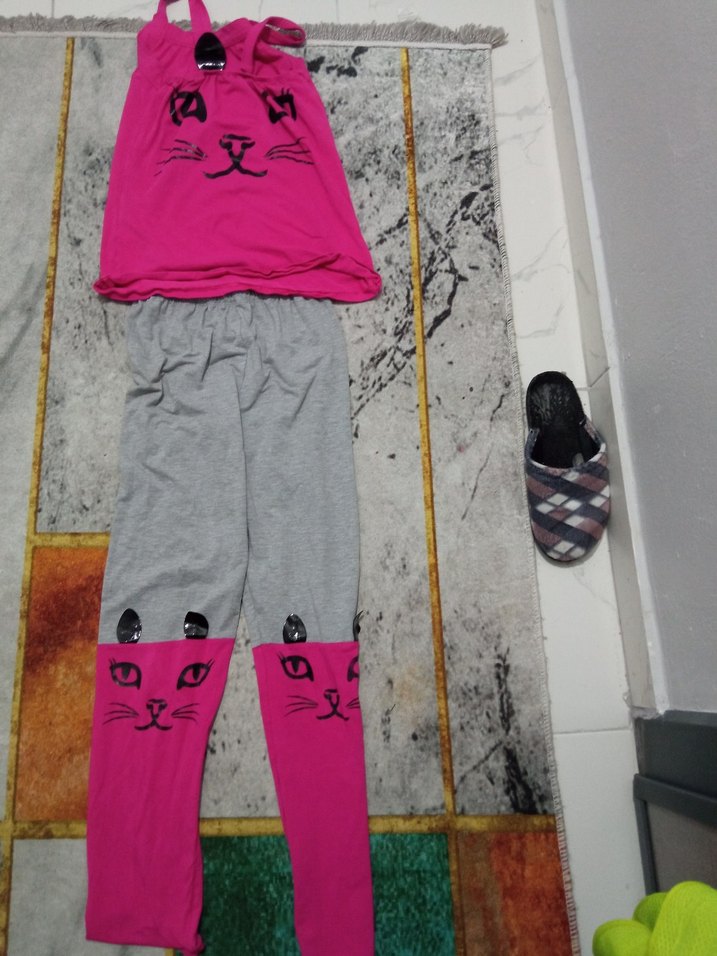 Örme kumaştan yapılmış pembe üst ve gri tayt, üzerlerinde baskılı kedi yüzleri bulunan rahat bir kıyafet.