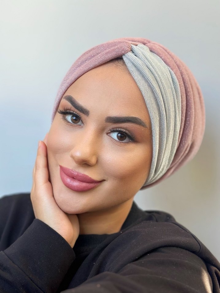 Pembe ve gri pastel renklerde, yumuşak sentetik kumaştan drapeli tasarıma sahip, bohem ve modest tarzda kadın bone.