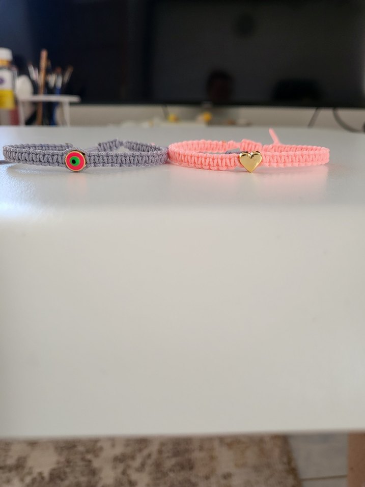 Pembe ve gri renkli örgü bileklik Açık pembe küçük kalp süsüne sahip bileklik, minimal bohem tarzıyla günlük kullanıma uygundur.