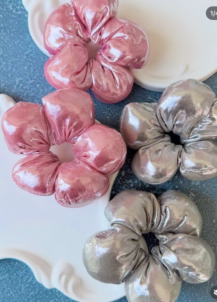 Parlak pembe ve gri saten elastik saç tokaları, gösterişli ve modaya uygun tarzlar için ideal.