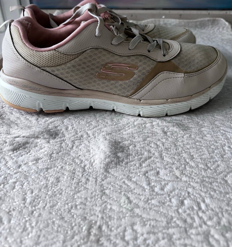 Bej ve gri renklerde, bağcıklı ve kauçuk tabanlı Skechers spor ayakkabılar. Desensiz tasarımıyla rahat ve şık bir sokak stili sunar. görüldüğü gibi ufak görüntü deformeleri vardır kullanımı çok rahattır onun dışında bir sorunu yoktur orijinaldir acil satılıktır sıfır fiyatını ve görüntüsünü de sona koydum bakabilirsiniz