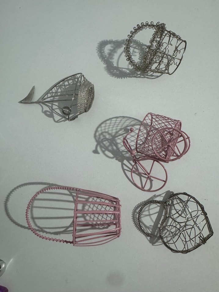 Pembe ve gri renkte, balık, bebek arabası ve farklı şekillerde tel sepetlerden oluşan dekoratif set.