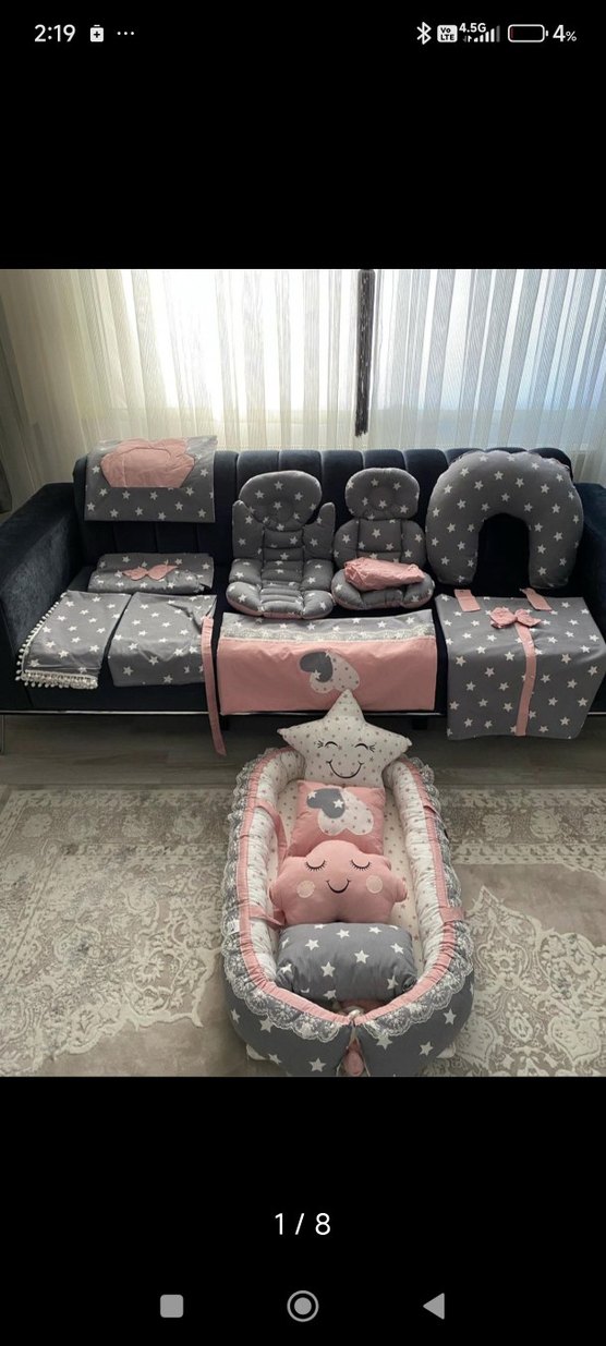 Pembe ve gri renklerde, yıldız desenli örme kumaştan yapılmış bebek uyku seti. Yastıklar, battaniyeler ve rahat bir bebek yatağı içerir. ⭐ babynest yatağı emzirme minderi emzirme örtüsü puset örtüsü puset carcafi puset minderi mama sandalyesi minderi alt açma çantası battaniye yorgan 4 adet süs yastığı yastık kilifi sadece 4 ay yatak emzirme minderi puset örtüsü kullanildi gerisi 0