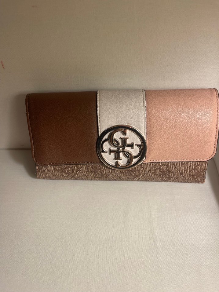 Kadınlar için deri cüzdan, açık tonlarında, baskılı desenli ve tokalı kapamalı. Günlük kullanım için çağdaş ve Paris tarzı uyumlu. Guess cüzdan