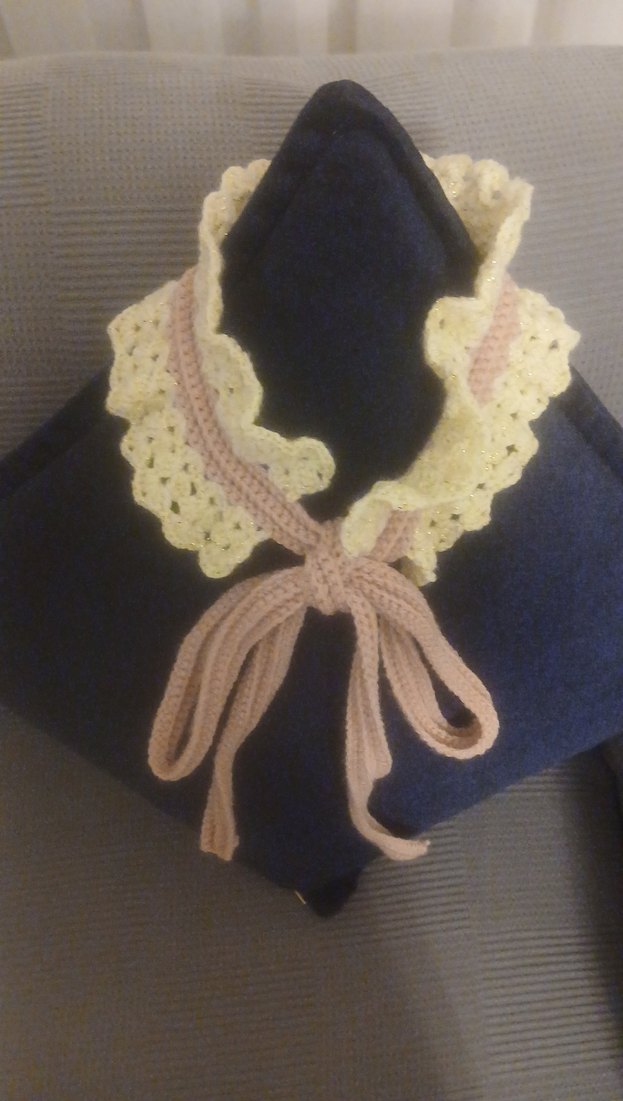 Pembe ve Kırık Beyaz Simli pastel tonlarda, örgü malzemeden yapılmış fırfırlı bohem tarzı kadın dantel boyunluk. Önde bağlanır, zarif bir görünüm sunar.