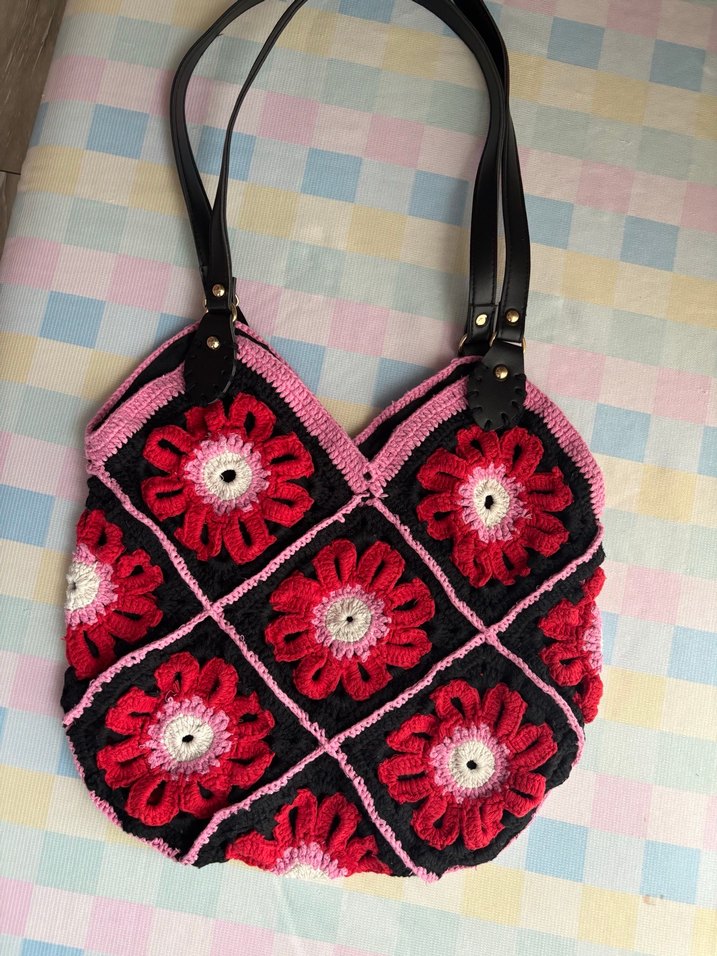 Pembe renkli, çiçek desenli ve örgü kadın çantası. Siyah saplarıyla bohem tarzını yansıtır. Günlük kullanıma uygundur. Kendi el emeğimle ördüğüm kadın örgü çanta