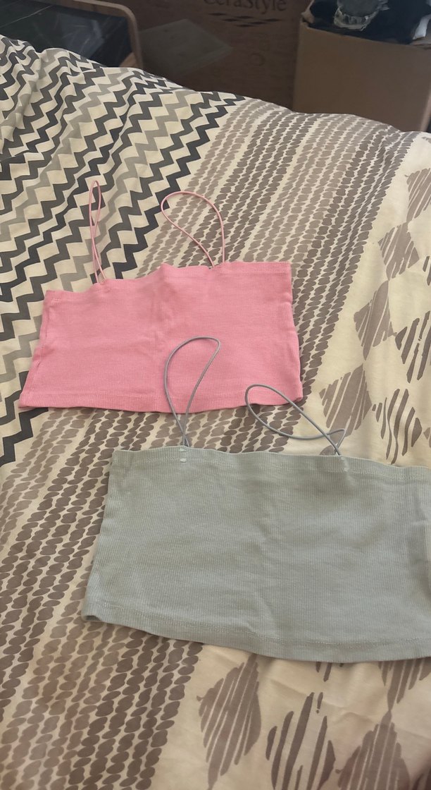 İnce askılı, yumuşak kumaştan yapılmış pembe ve mavi pastel bebek askılı üstler.