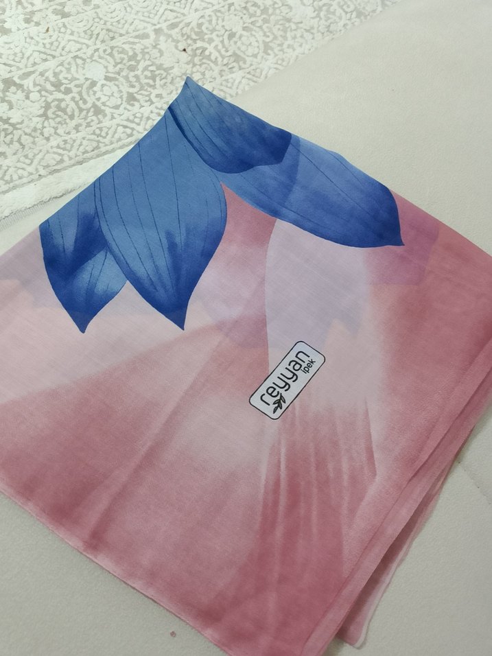 Kadınlar için pembe ve mavi pastel renklerde, drapeli ve yumuşak sentetik kumaştan yapılmış fular. Minimalist stile uygun.