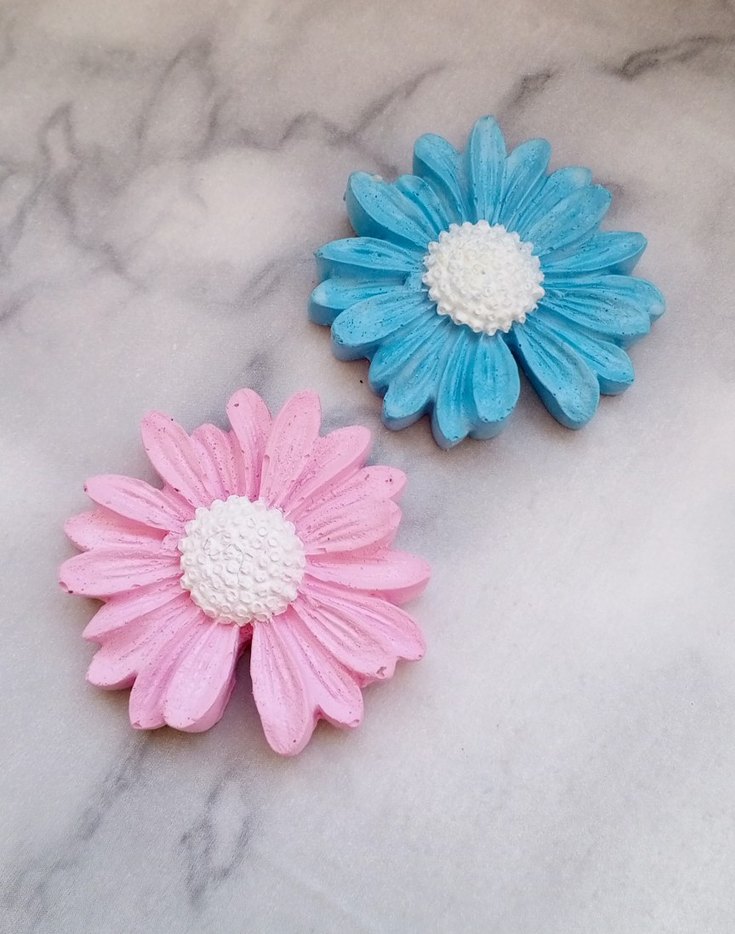 Pastel pembe ve mavi renkte, beyaz dokulu merkezli çiçek şeklinde magnet adet fiyatıdır yüksek miktarda alımda indirim yapılır