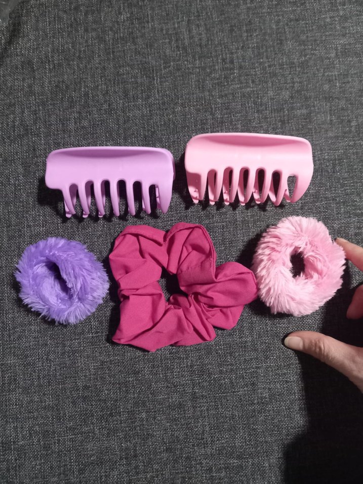 Pastel pembe ve mor mandal, peluş ve kumaş bez elastik saç tokaları yeni beşli set birlikte, yumuşak, rahat ve şık görünüm sağlar. Farklı renk ve çeşitleri için sayfama bakabilirsiniz.