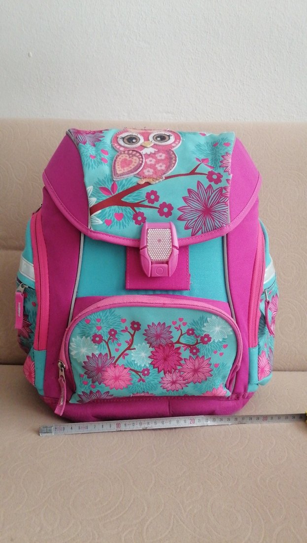 Pembe ve renkli desenli çocuk okul çantası