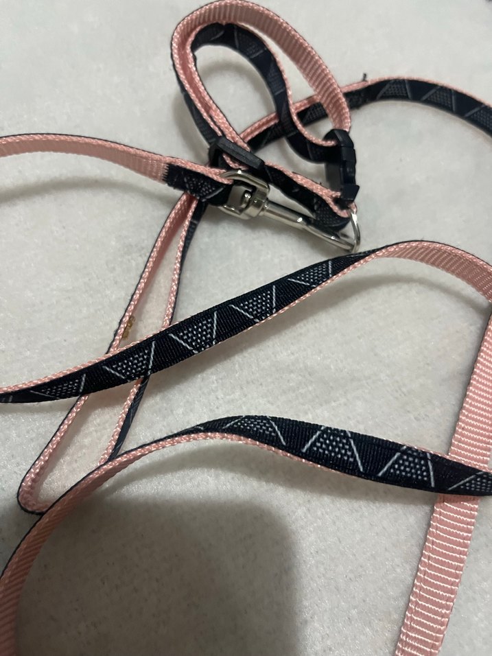 Koyu pembe ve siyah renklerde, üçgen desenli köpek tasması, metal toka ile güvenli kullanım sağlar. Küçük köpekler için uygundur