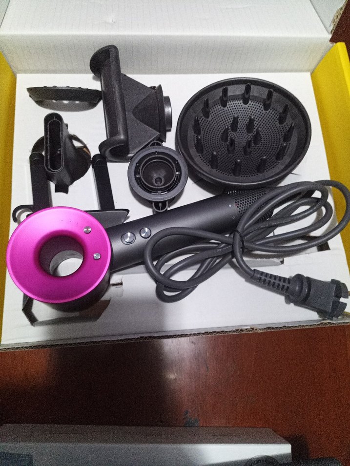 Çeşitli başlıklarla birlikte gelen koyu pembe ve siyah saç kurutma makinesi. Uzun kablo ile pratik kullanım sağlar. ♀️