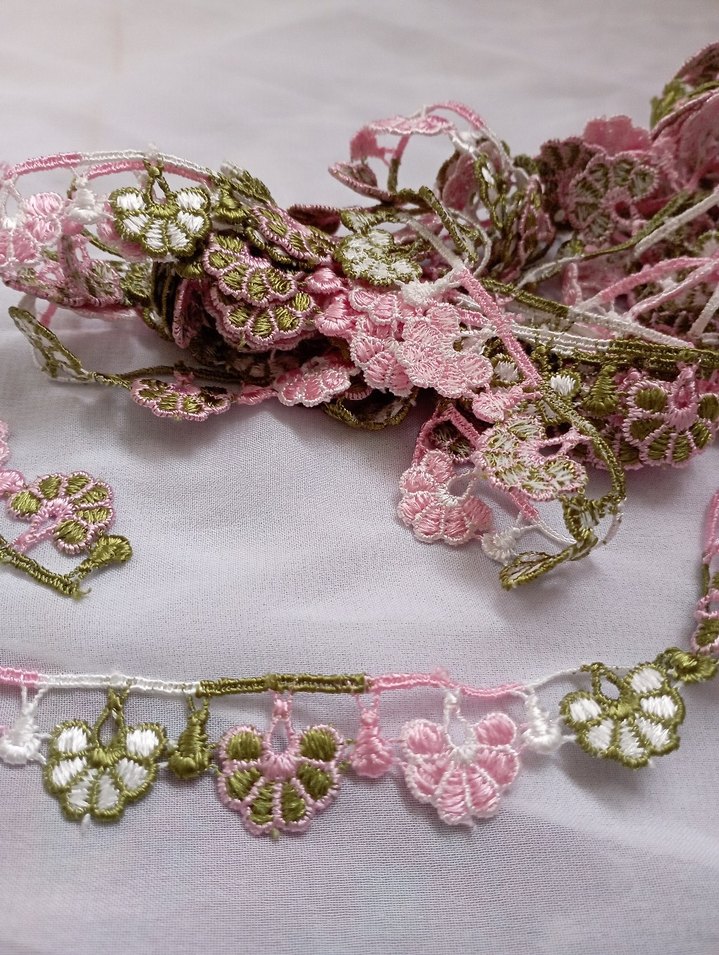 Pembe ve yeşil çiçek desenlerine sahip bohem nakış şerit, el işleri ve dekorasyon için uygundur.