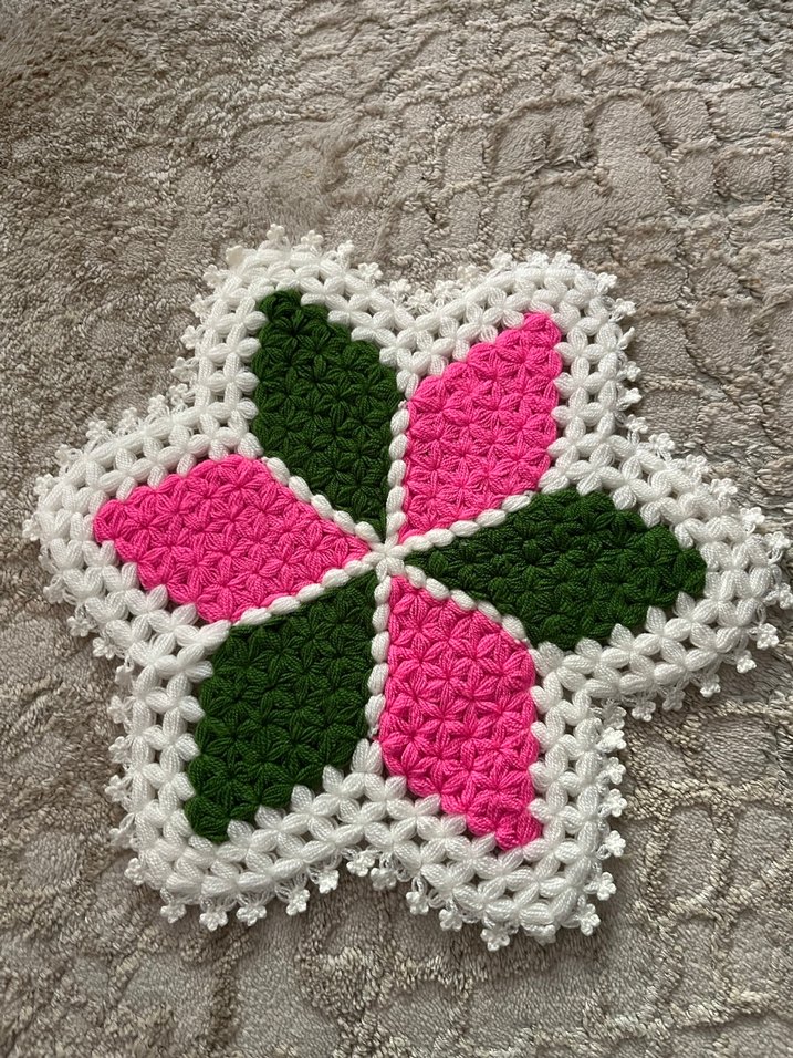Pembe ve yeşil yapraklardan oluşan çiçek motifli, beyaz kenarlıklı el örgüsü Geleneksel dokuma tekniği ile hazırlanmıştır.