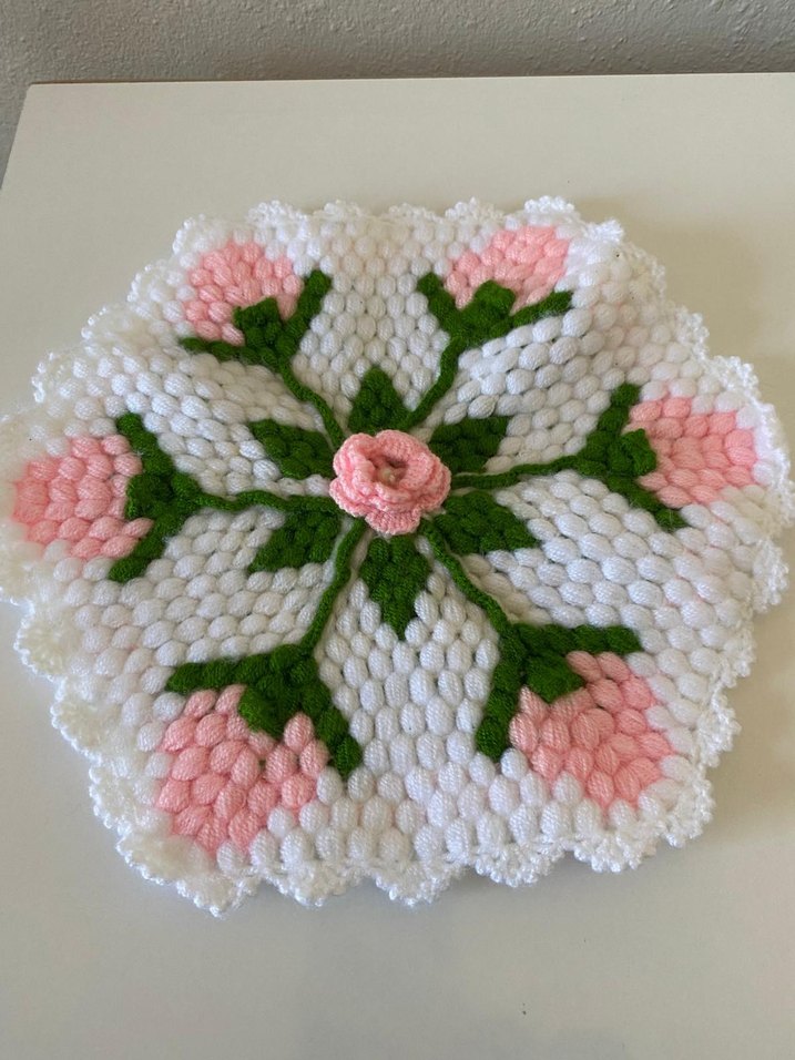 Pembe ve yeşil çiçek desenli, beyaz dokulu örgü lif Her yüzeye zarif bir dokunuş katar.