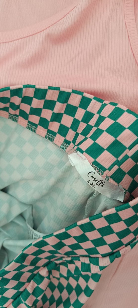 Pastel pembe renkte, yeşil ve pembe piti kareli krop takım alt beden xl üst beden m