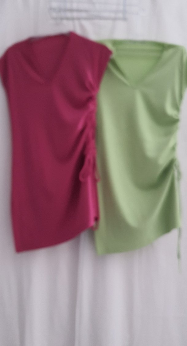 Pembe ve yeşil renkli, v yakalı ve yandan ayarlanabilir ip drapeli detaylara sahip, sentetik kumaştan yapılmış, midi boyda ve dar kesim bluz veya tunik. Minimalist ve çağdaş tarzda, günlük kullanıma uygun. iki ürün 300