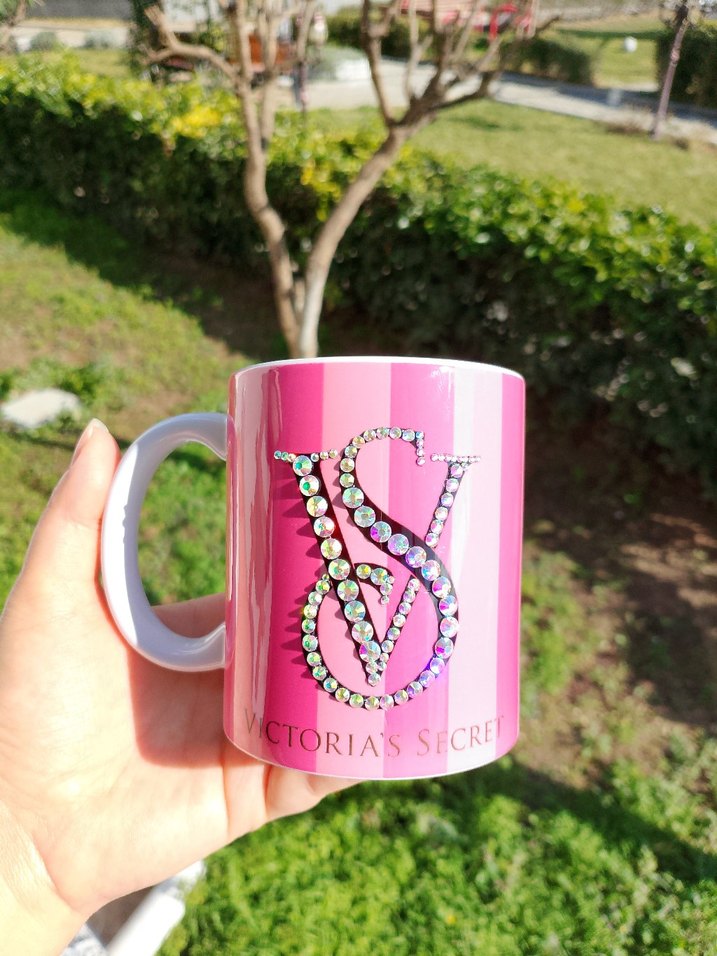 Renkli taşlarla süslenmiş Victoria's Secret logosu bulunan pembe kupa, beyaz saplıdır. Günlük kullanım için uygundur. ☕