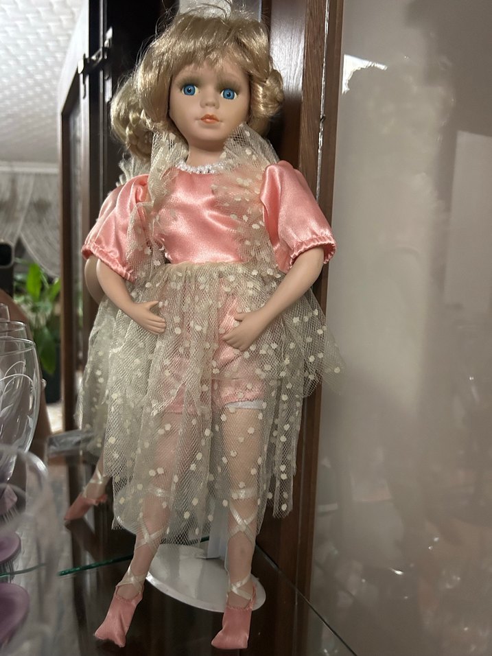 Bu vintage tarzı porselen bebek, şeffaf puantiyeli tül detaylı pastel pembe saten elbise giymektedir. Sarı saçlı ve mavi gözlüdür, stand üzerinde durmaktadır.