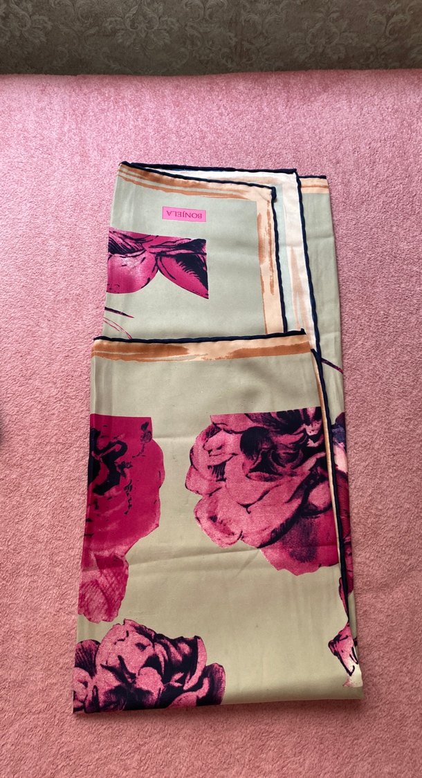 Pembe pastel renkte, drapeli kadın fular. Yumuşak sentetik kumaştan vintage çiçek desenli, üzerinde 'DINO' yazısı bulunur. Bohem ve trend stil için uygun.