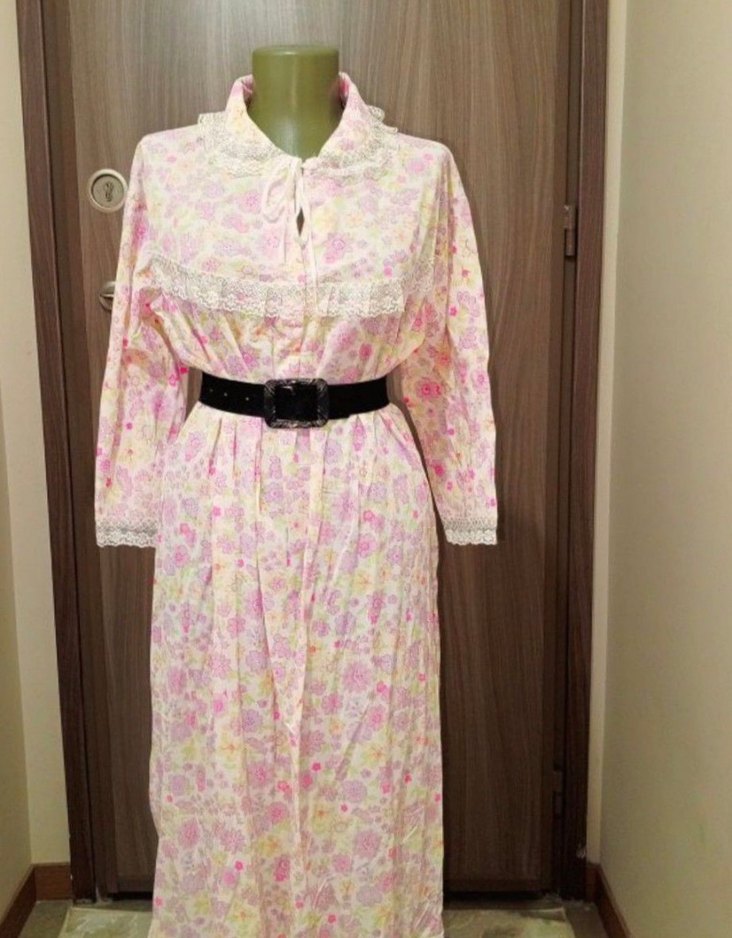 Uzun, bol kesim pembe tonlarında, bağlama desenli, vintage dantel detaylı, uzun kollu bohem tarzda kadın elbise. Siyah kemerle şekillendirilebilir.