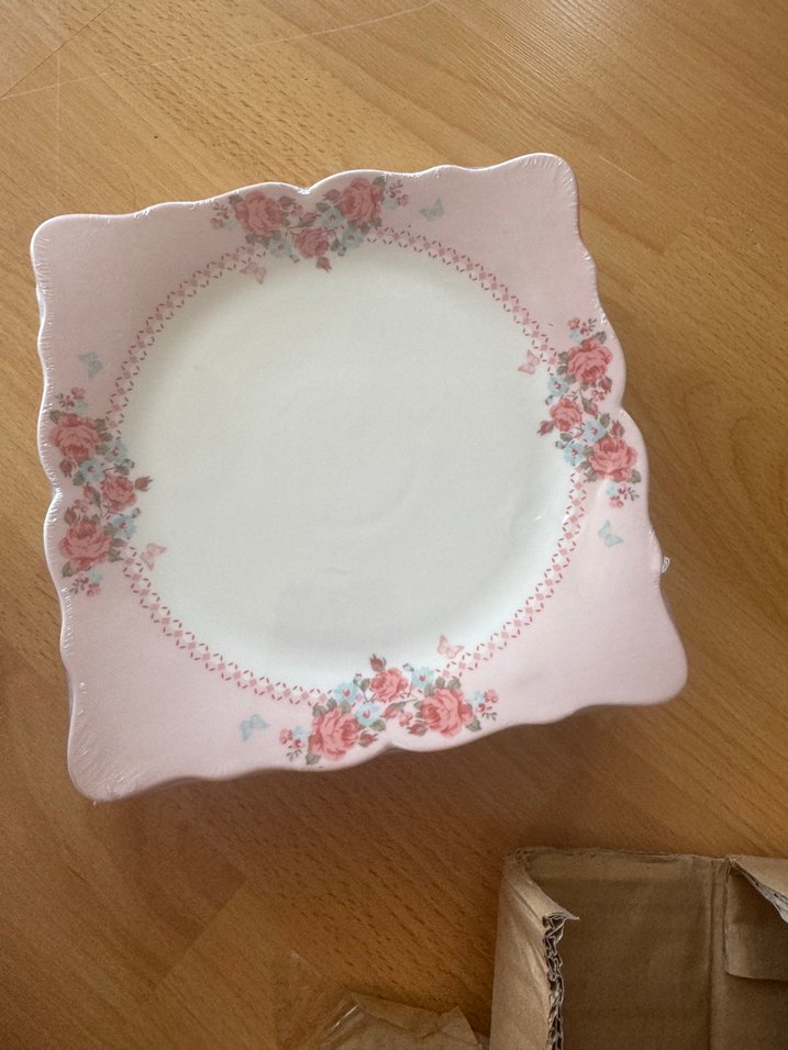 Pastel pembe kenarlı, çiçek desenli vintage kare tabak. Düz beyaz ortası ve hafif dalgalı kenarları vardır. ️