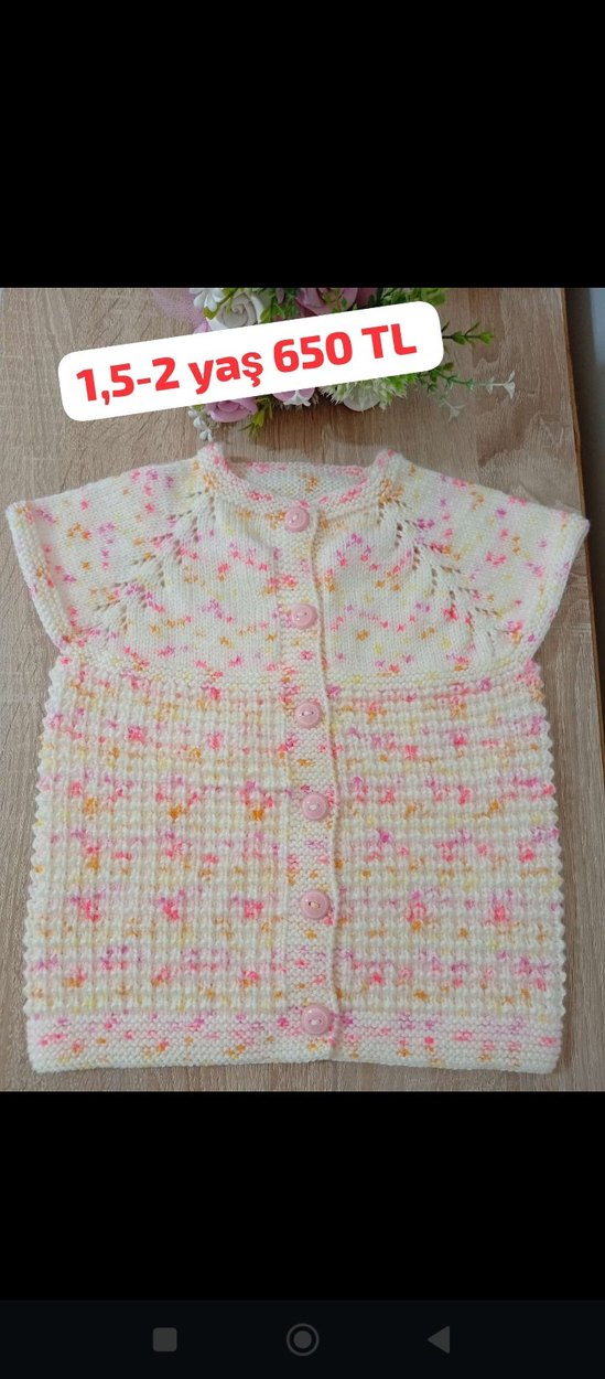 Pembe renkli, vintage desenli ve örgü kumaştan yapılmış, kolsuz ve bol kesim kız yeleği. 1,5-2 yaş için uygundur.