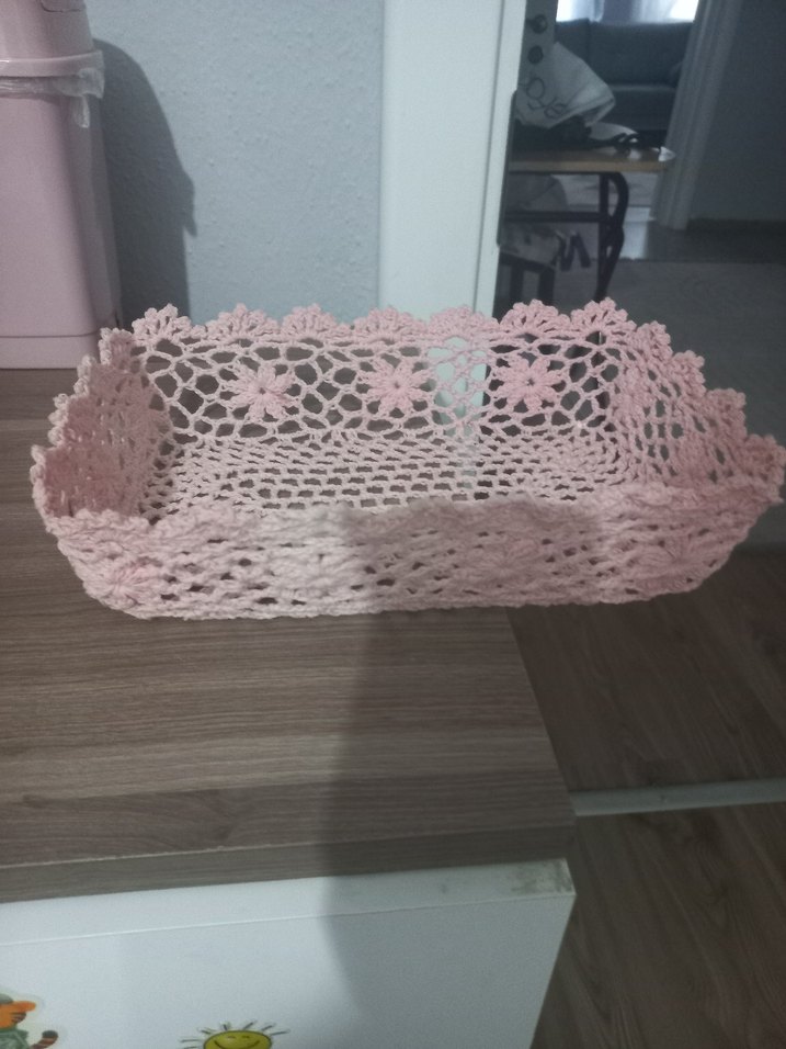 Pembe renkte, vintage tarzında el örgüsü bir sepet. Hafif eşyalar için dekoratif kullanıma uygundur.