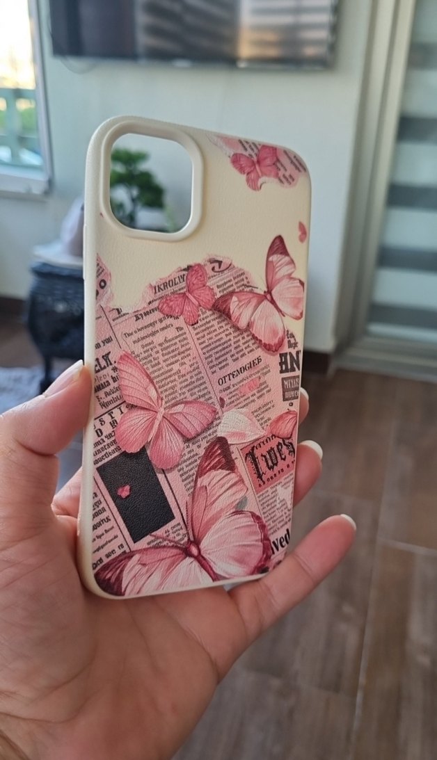 Pembe pastel tonlarında, vintage gazete baskılı ve kelebek desenli telefon kılıfı.