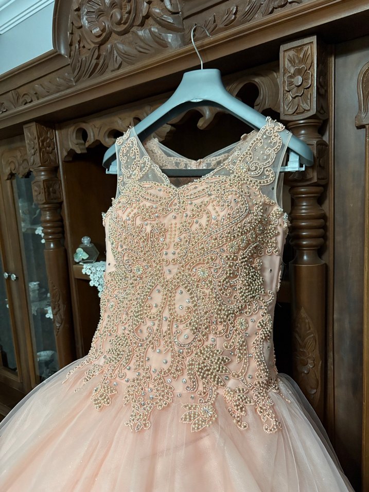 Pembe pastel renkli, straplez yaka ve kolsuz tasarıma sahip bu dar kesim nişan elbisesi, detaylı nakış ve boncuk işlemeleri ile vintage ve gösterişli bir stile sahiptir.